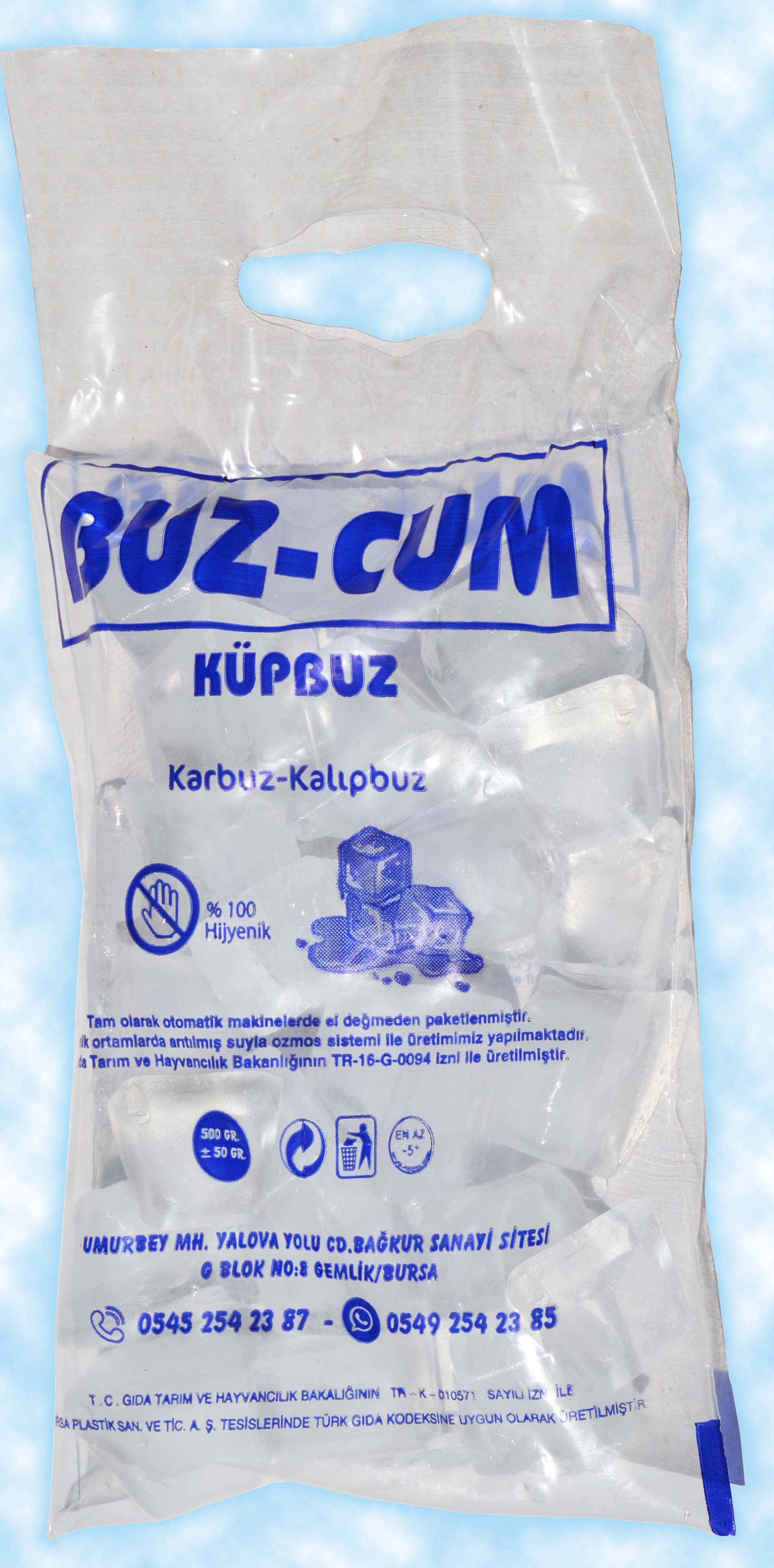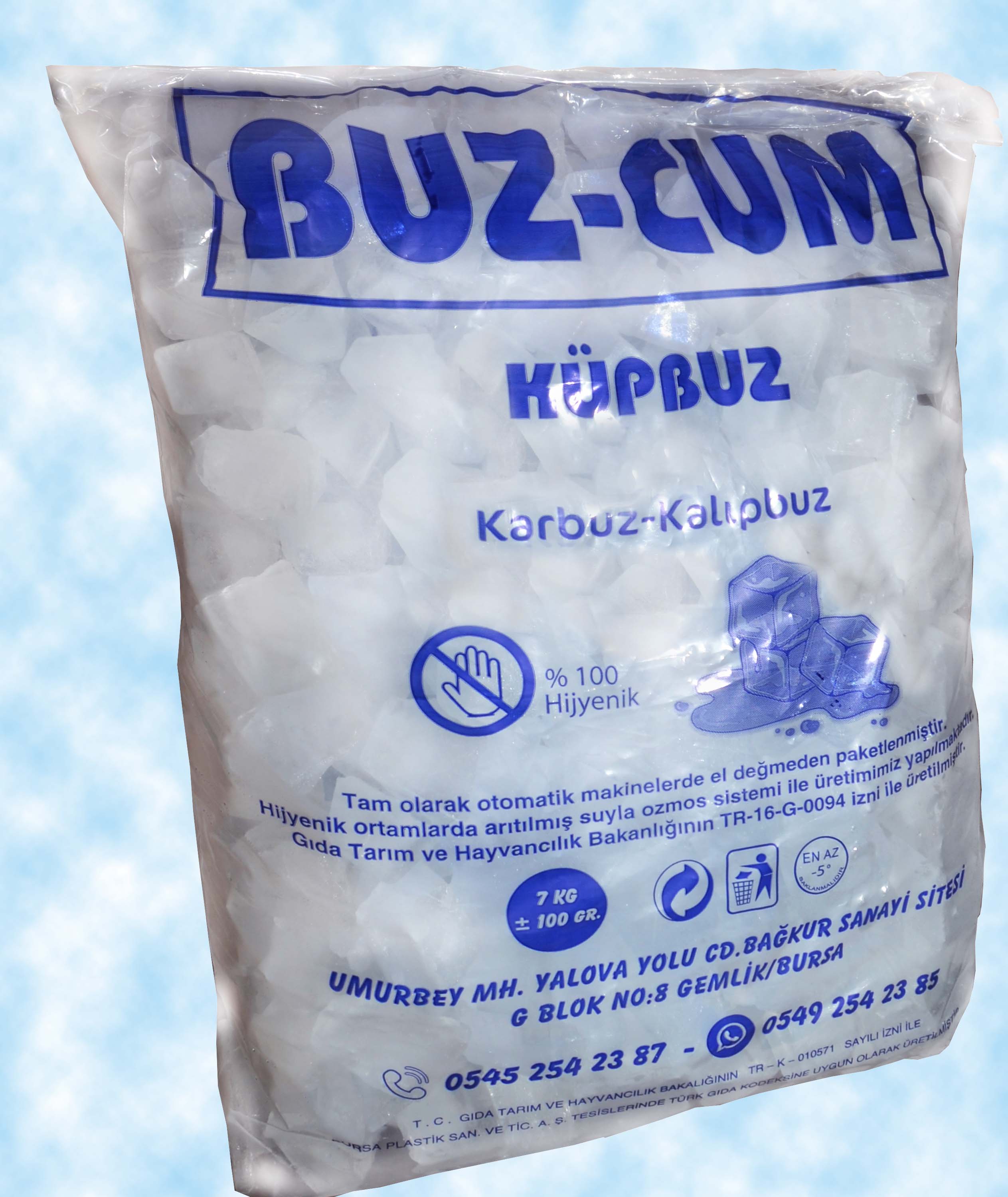 Hijyenik ortamda, buz yapmaya uygun, ozonla zenginleştirilmiş su ile ürettiğimiz buzlarımız, içme suyu yönetmeliğine uygun şişe su kalitesine sahiptir. Buzcum üretiminin her aşamasında titizlikle su kalite değerleri kontrol edilmektedir.