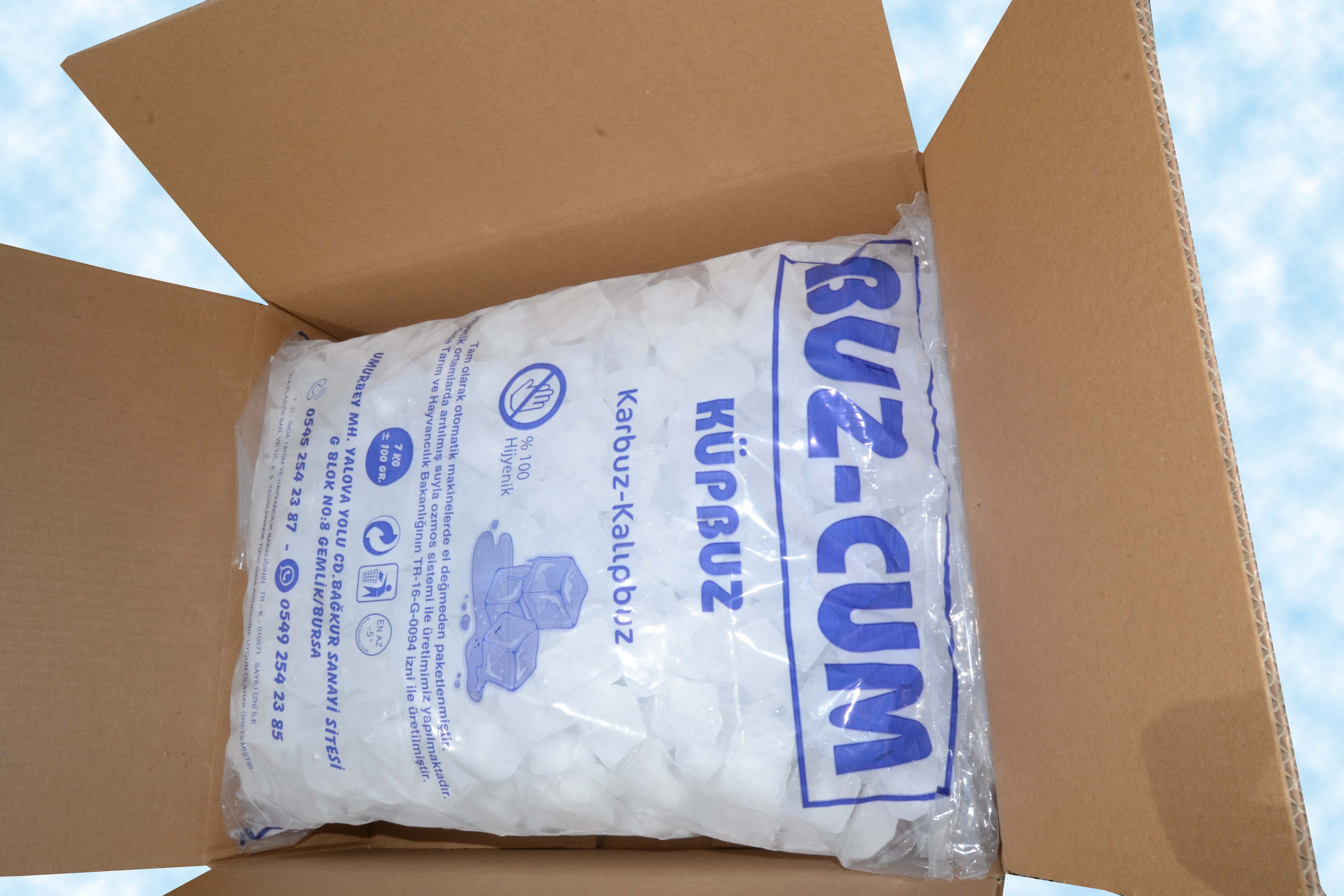 Küp buzlarımız; 500 gramlık 24 lü kolide 12 kg. ve 7 kilogramlık 2 li kolide 14 kg. olarak,